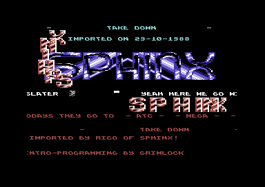 - TAKE DOWN - IMPORTED ON 23-10-1988 - SLATER - YEAH HERE WE GO WIT ODAYS THEY GO TO - ATC - - MEGA - - M - TAKE DOWN - IMPORTED BY RICO OF SPHINX! INTRO-PROGRAMMING BY GRIMLOCK GRAPHICS BY GRAYHOUND MUSIC BY JT - - TAKE DOWN - IMPORTED ON 23-10-1988 - ..BIEP.. HERE IT IS - TAKE DOWN - IMPORTED BY RICO OF SPHINX CRACKED BY ESI A REAL GOOD GAME ... CHECK OUT THE NEW SPHINX DEMO'S ...... SLATER - YEAH HERE WE GO WITH SOME QUICK OVERSEAS HELLO HOW ARE YOU TODAYS THEY GO TO - ATC - - MEGA - - MAYHEM - -EPIC - B.R - - INC - - NPN - AND NOW THE EUROPEAN TO : ALL THE SPHINX MEMBERS - WANDERERS - BROS - ZZS - L99 - ROM - STRIKE FORCE L8R - - TAKE DOWN - IMPORTED BY RICO OF SPHINX! INTRO-PROGRAMMING BY GRIMLOCK GRAPHICS BY GRAYHOUND MUSIC BY JT CONTACT SPHINX CALL RICO AT:31-53-334851 SIDE AT:31-10-4501274 TBF AT:31-4490-35079 OR OUR VMB IN THE STATES DIAL 206-562-5600 BOX # 2576 - ..BIEP.. HERE IT IS - TAKE DOWN - IMPORTED BY RICO OF SPHINX CRACKED BY ESI - 2A REAL GOOD GAME - CHECK OUT THE NEW SPHINX DEMO'S - YEAH HERE WE GO WITH SOME QUICK OVERSEAS HELLO1 - - ATCB - $MEGAB - 6MAYHEM - -EPIC - B.RB - #INCB - - NPN - AND NOW THE EUROPEAN TO : ALL THE SPHINX MEMBERS - WANDERERS - BROS - ZZS - L99 - ROM - STRIKE FORCE L8R - ;IMPORTED BY RICO OF SPHINX! - 4 =INTRO-PROGRAMMING BY GRIMLOCK - 6GRAPHICS BY GRAYHOUND - + .CONTACT SPHINX - 8OR OUR VMB IN THE STATES -
