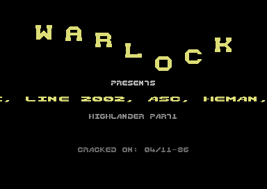 B **** COMMODORE 64 BASIC V2 **** 64K RAM SYSTEM 38911 BASIC BYTES FREE READY. LOAD"HIGHLANDER 1",8,1: SEARCHING FOR HIGHLANDER 1 LOADING READY. RUN - A B CBD E F G H I J KYLXM N[O P Q - A B CAD ECF GFH IUJ KYLXMZN[OIPVQT - GGHHIIJJKLLMNOPQRSTUVXY[/^ "$&(+-0369= - PRESENTS HIGHLANDER PART1 CRACKED ON: 04/11-86 -