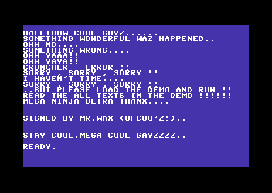 HALLIHOW COOL GUYZ...... SOMETHING WONDERFUL WAZ HAPPENED.. OHH NO.... SOMETHING WRONG.... OHH YAAA!! OHH YAYA!! CRUNCHER - ERROR !! SORRY , SORRY , SORRY !! I HAVEN'T TIME.... SORRY , SORRY , SORRY !! ..BUT PLEASE LOAD THE DEMO AND RUN !! READ THE ALL TEXTS IN THE DEMO !!!!!! MEGA NINJA ULTRA THANX.... SIGNED BY MR.WAX (OFCOU'Z!).. STAY COOL,MEGA COOL GAYZZZZ.. READY. -